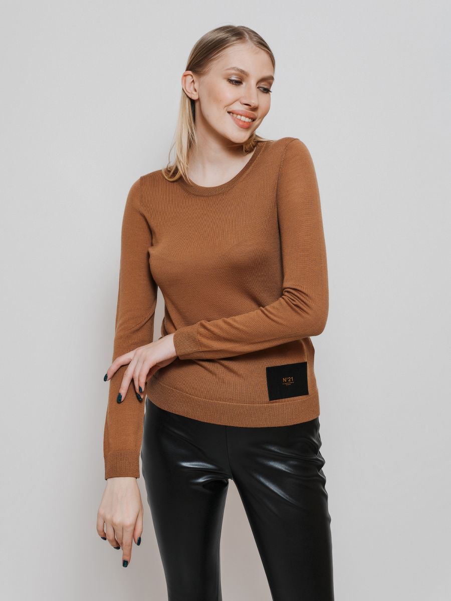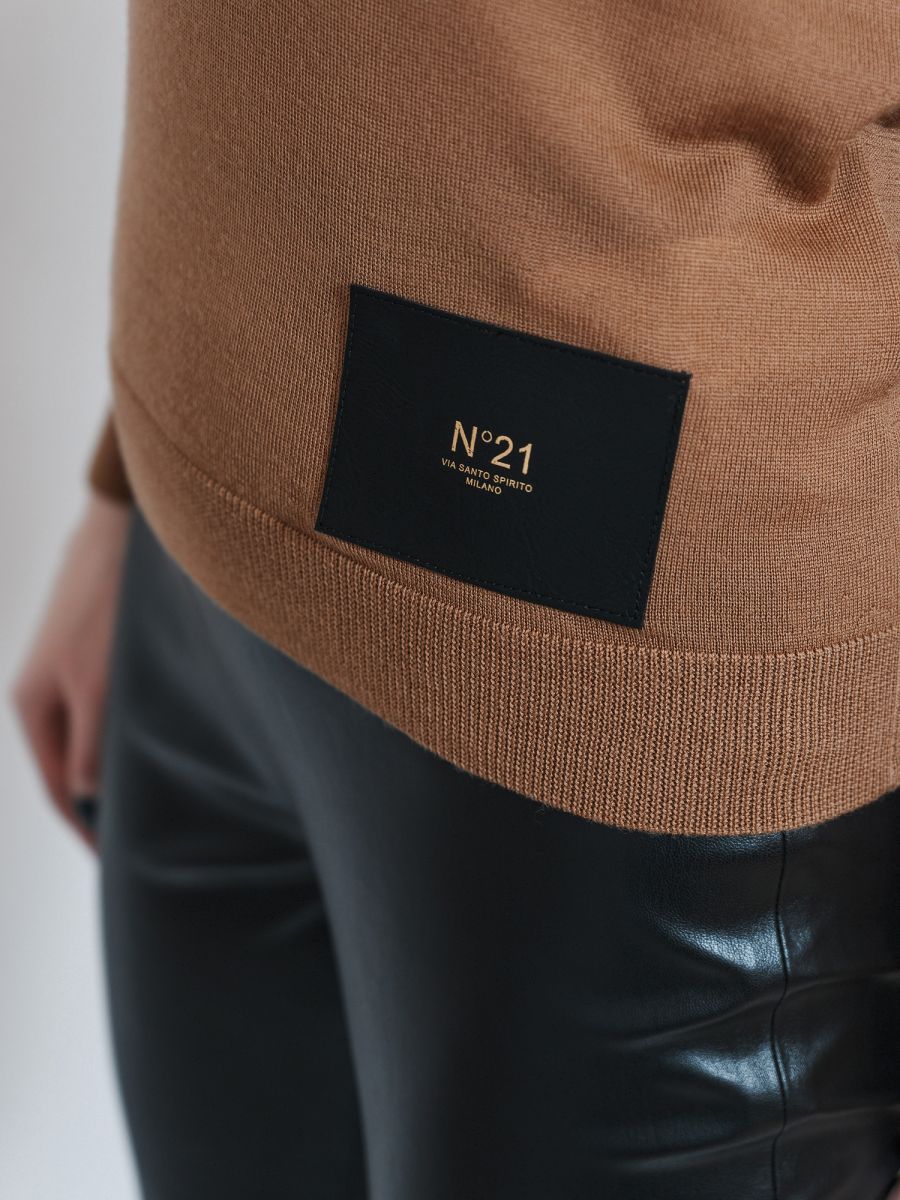 Ультрамягкий джемпер из натуральной шерсти украшен нашивкой с логотипом N°21, что добавляет мгновенную узнаваемость бренда. Универсальная и лаконичная модель прекрасно довершит многочисленные образы.