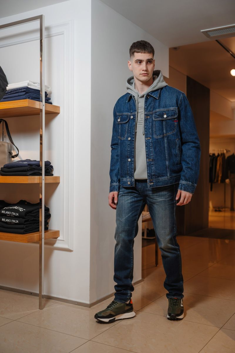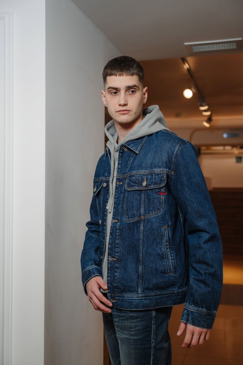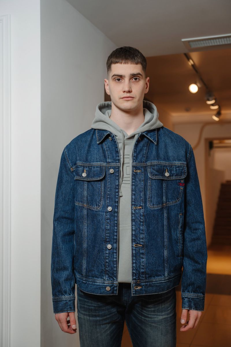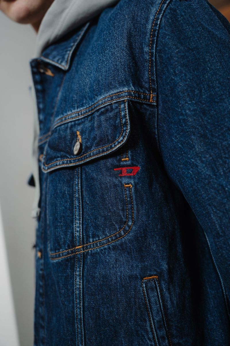 Джинсовая куртка прямого кроя, с изящным декором в виде вышитого красного логотипа буквы D. Изготовлена из денима с добавлением органического хлопка.