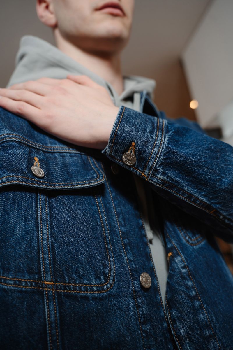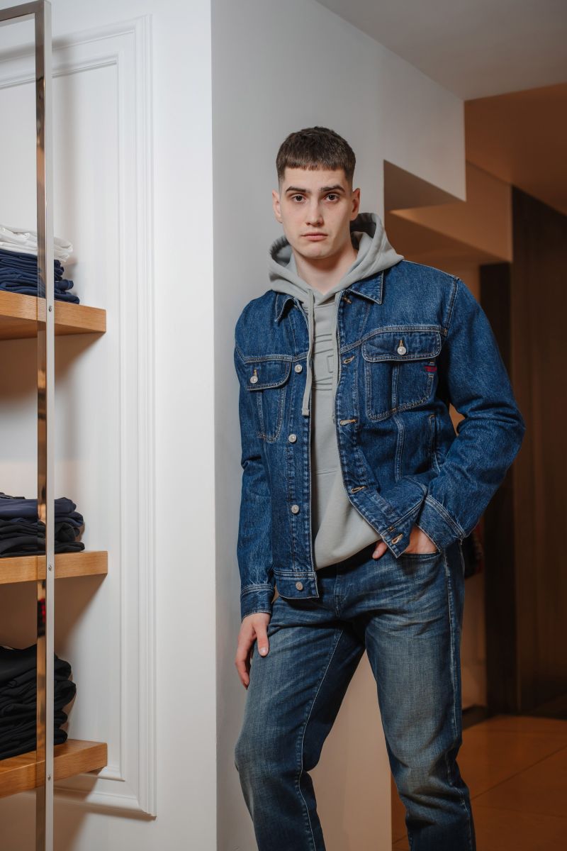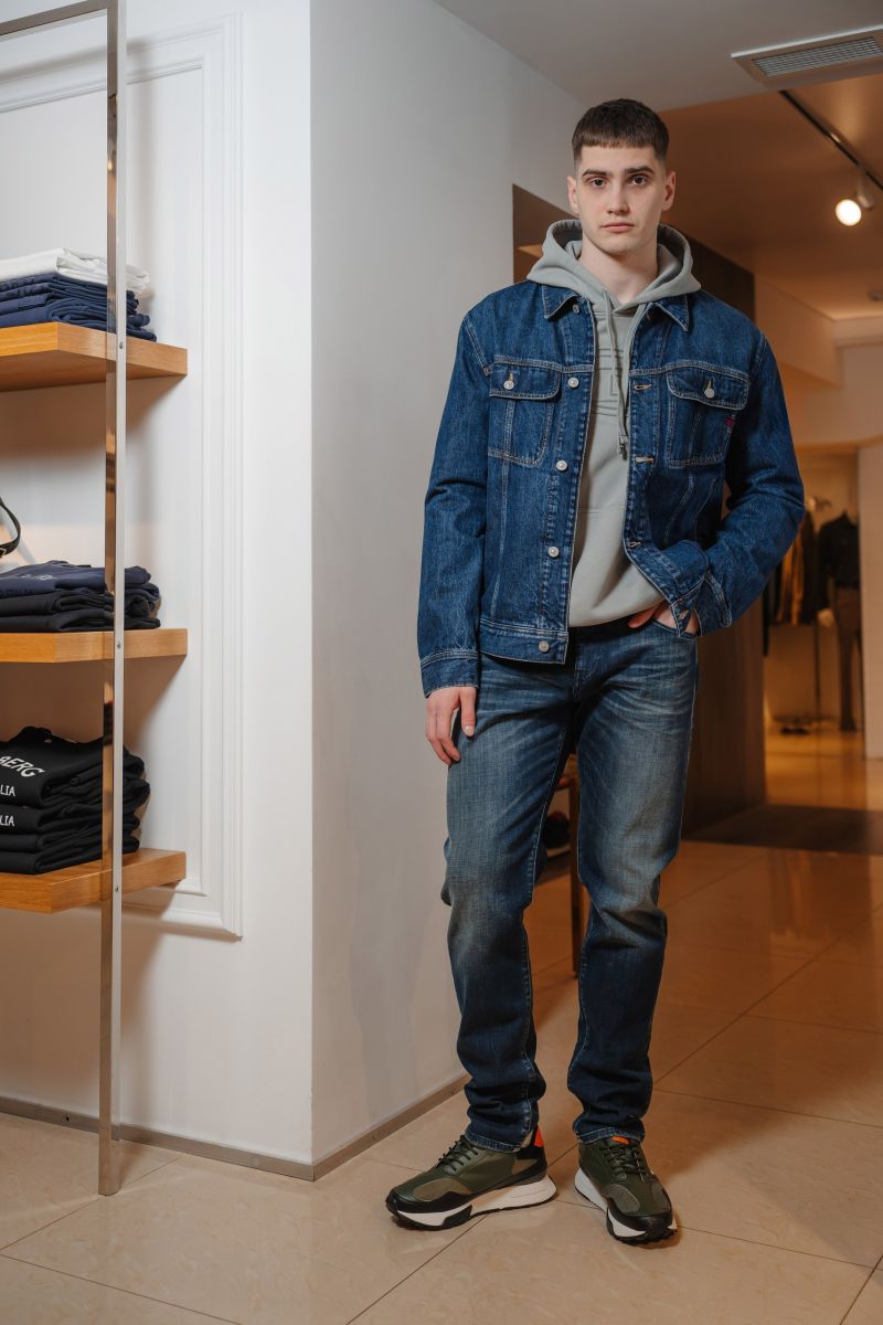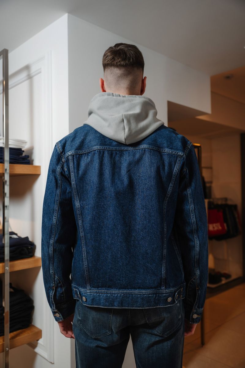 Джинсовая куртка прямого кроя, с изящным декором в виде вышитого красного логотипа буквы D. Изготовлена из денима с добавлением органического хлопка.