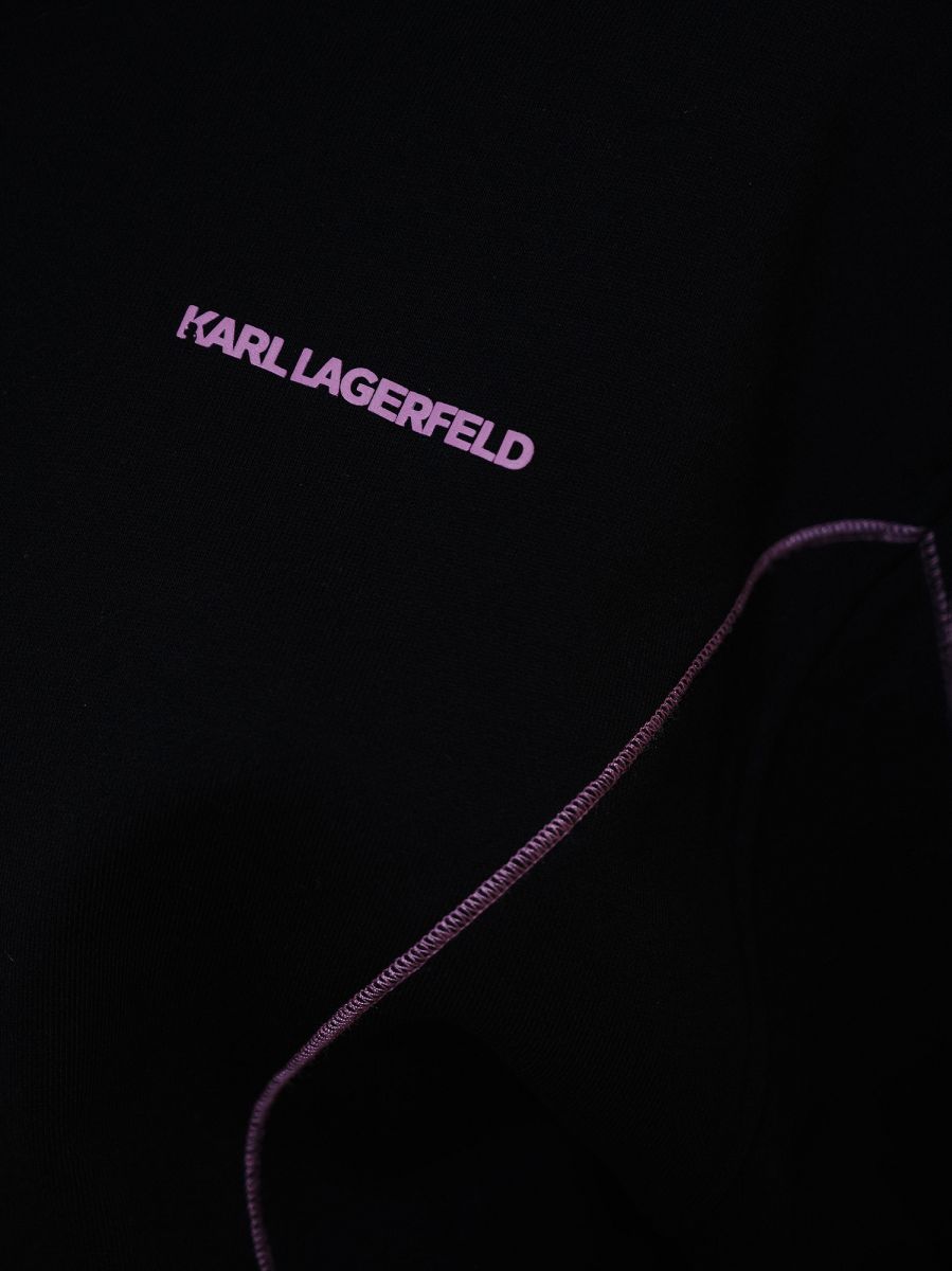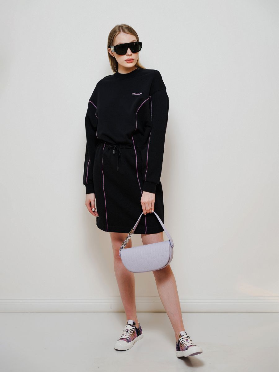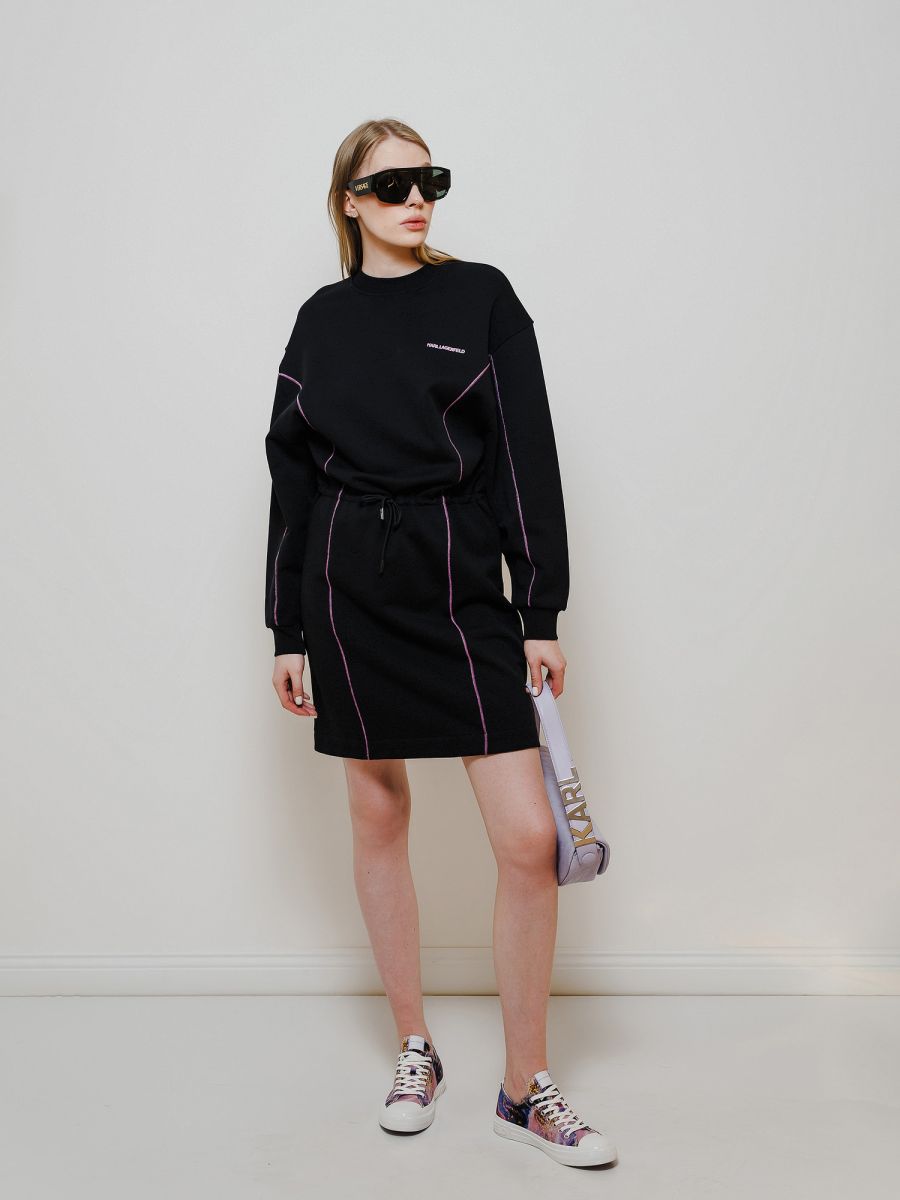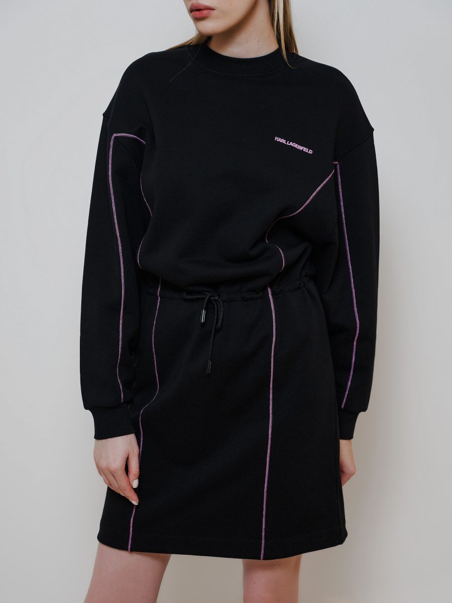 Стильное повседневное платье от бренда KARL LAGERFELD выполнено из сертифицированного органического хлопка, В процессе изготовления не использовались химические удобрения, пестициды и генетически модифицированные семена. Теплый и приятный к телу материал с начесом доставит массу положительных эмоций. Пояс на кулиске подчеркнет Вашу талию и добавит образу женственности.