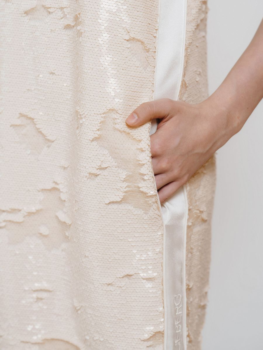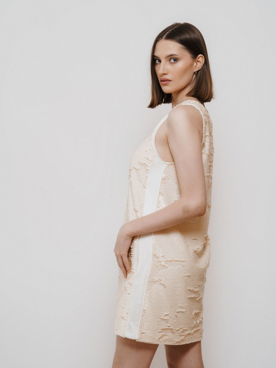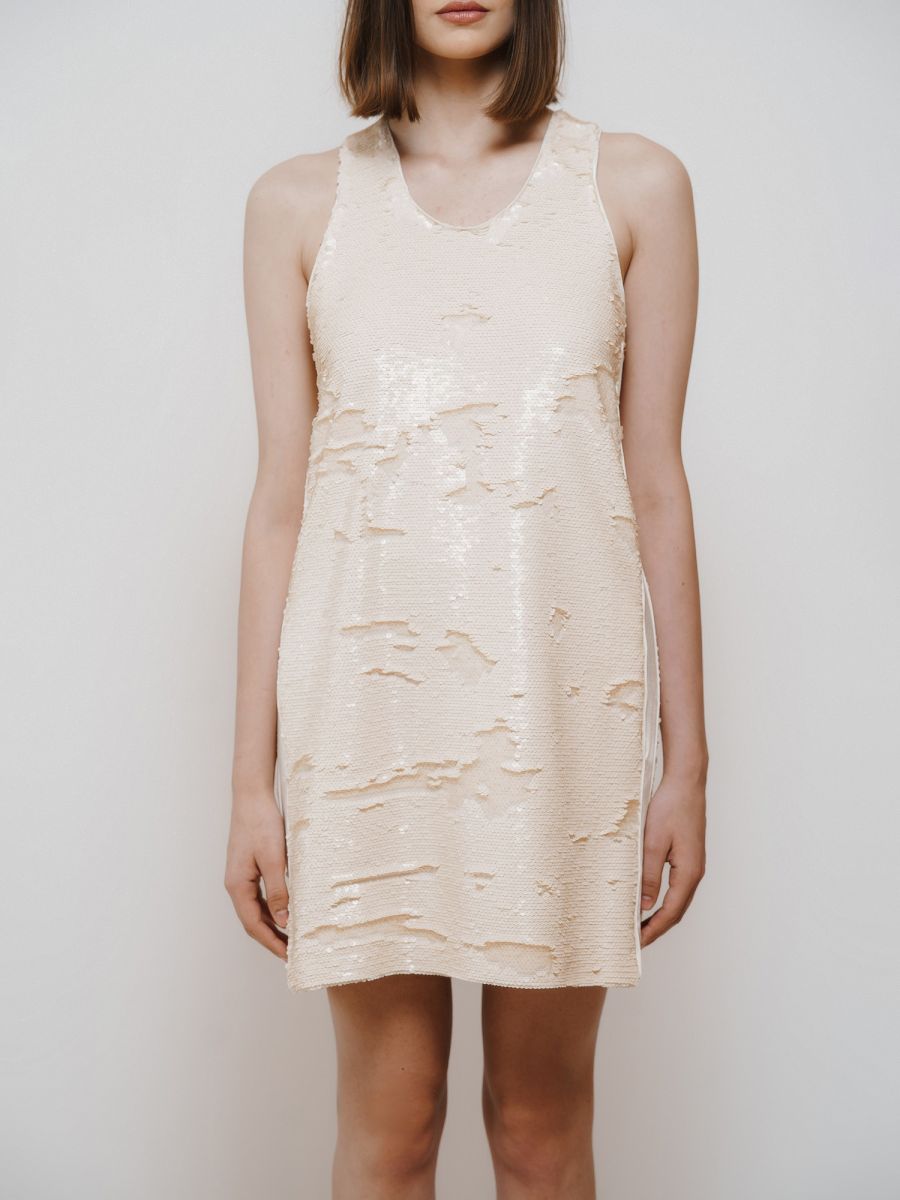 Это привлекающее внимание мини-платье маечного типа- яркий пример эффектного вечернего образа. В фокусе внимания его будут мерцать пайетки в лучах вечерних огней или яркого солнца, Данная модель станет удачным выбором для светского мероприятия: осталось встать на каблуки и взять в руки клатч.