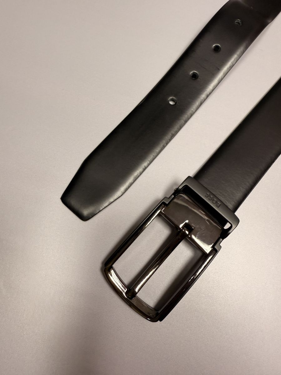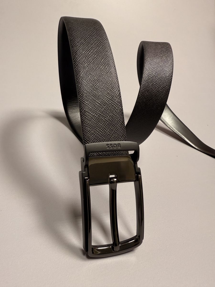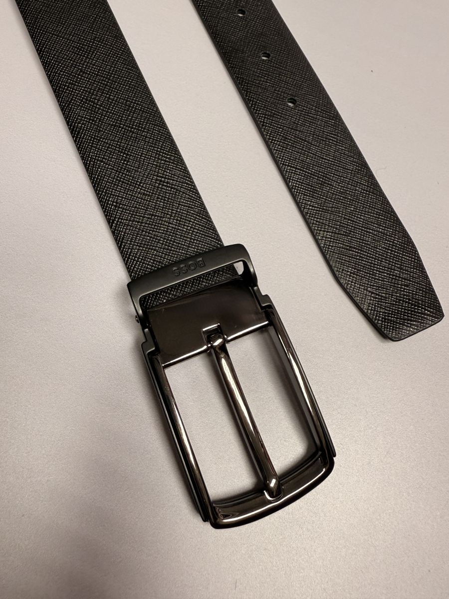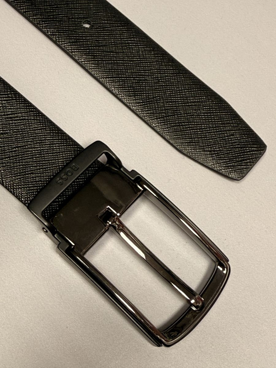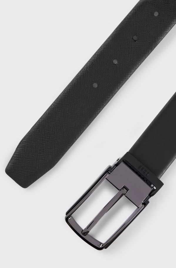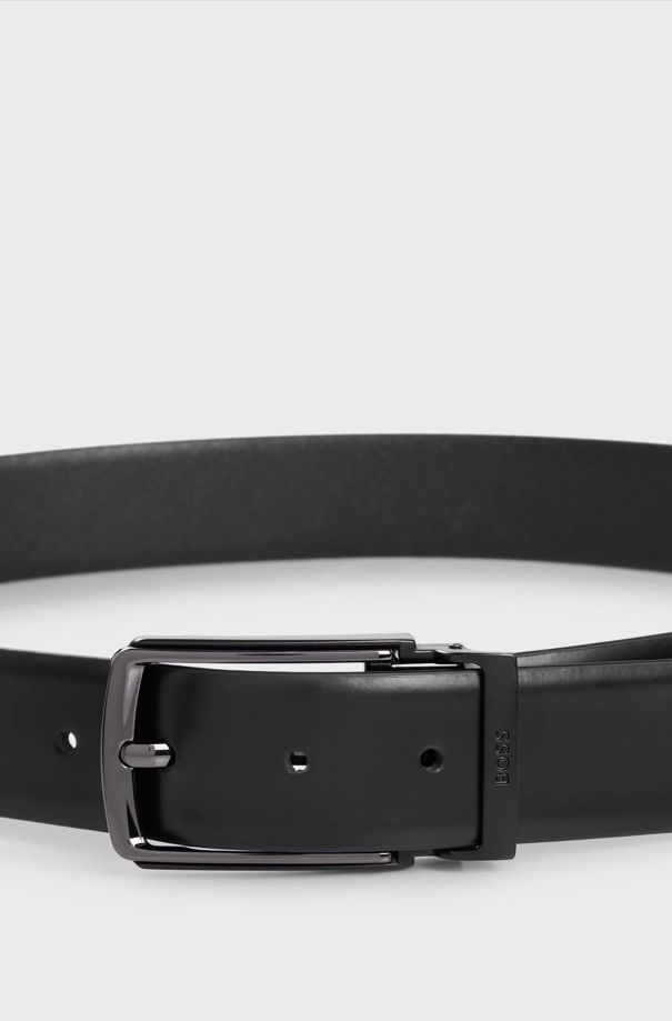 Оригинальный ремень от бренда BOSS из итальянской зернистой кожи с квадратной металлической пряжкой. Дополните им Bаш элегантный повседневный образ.