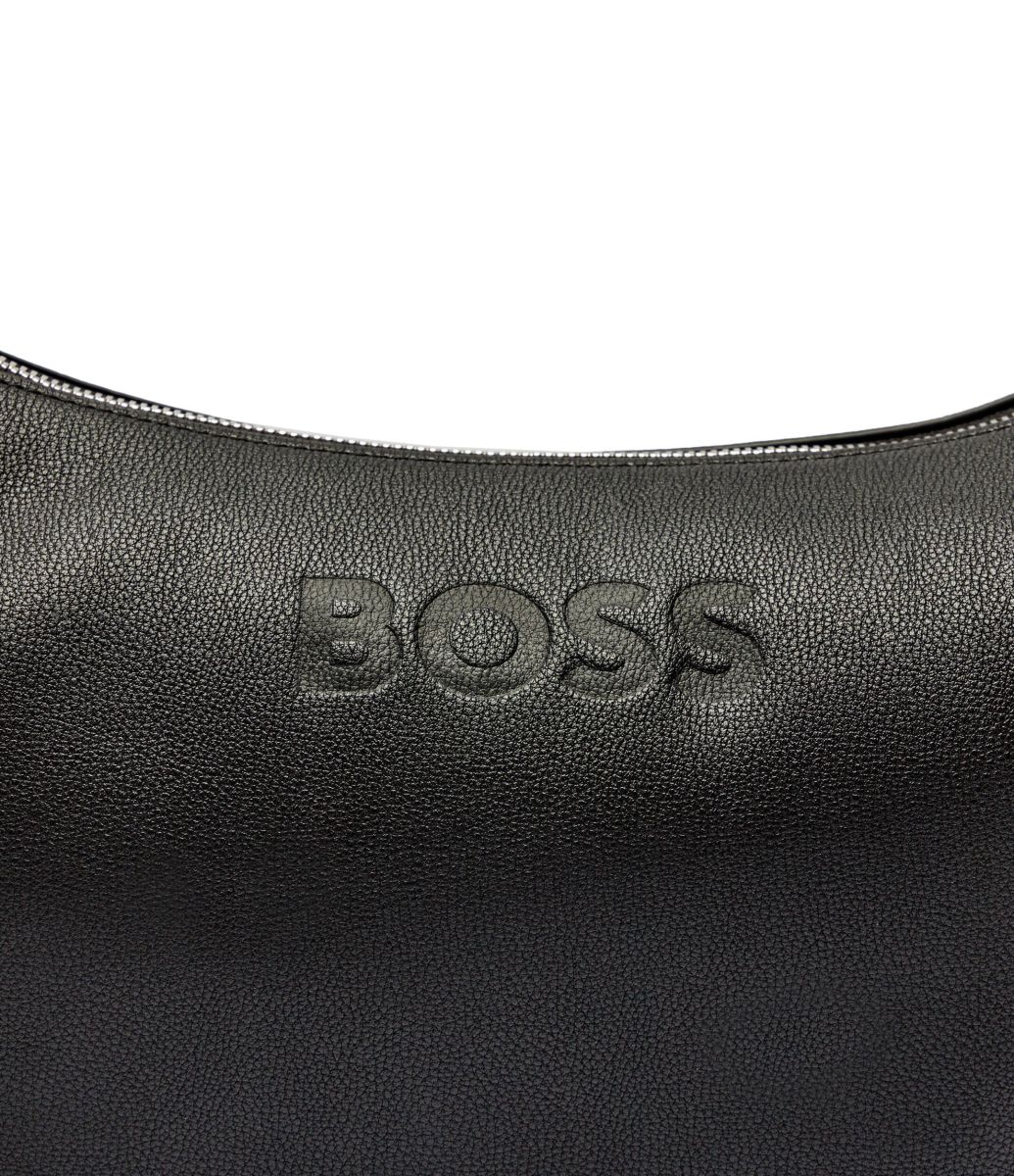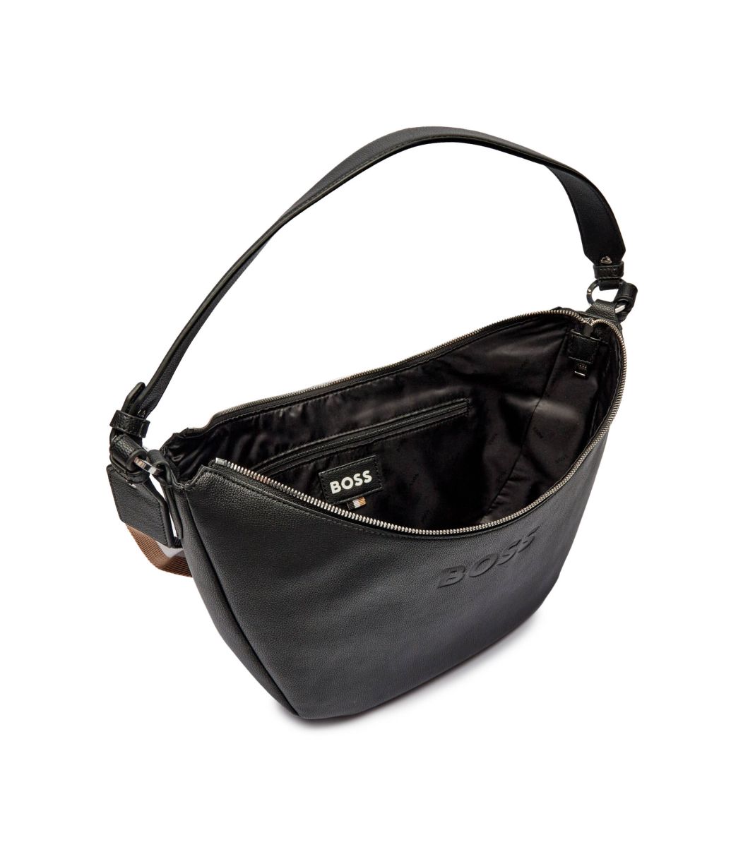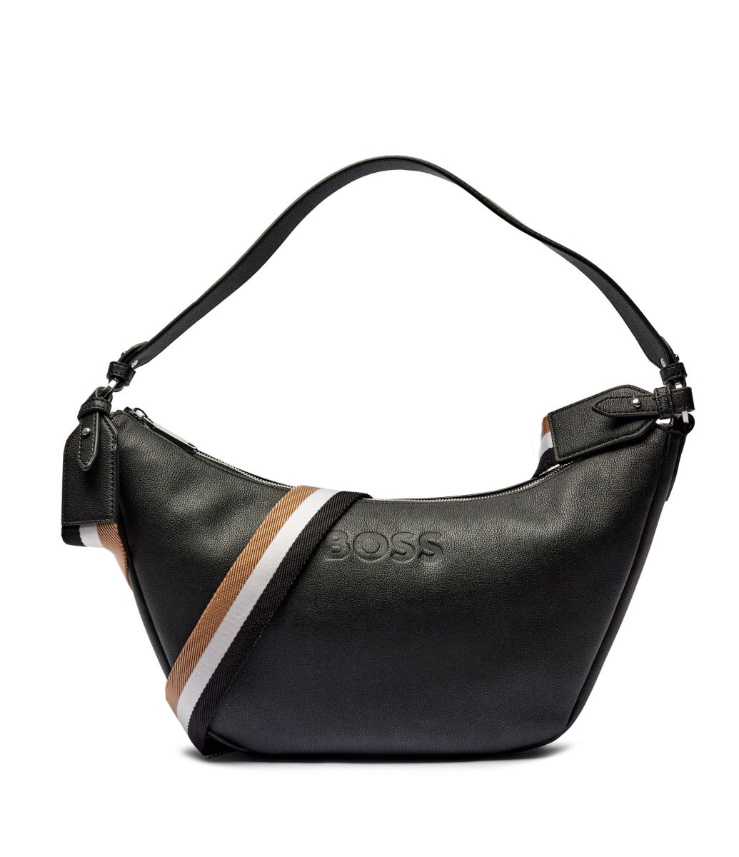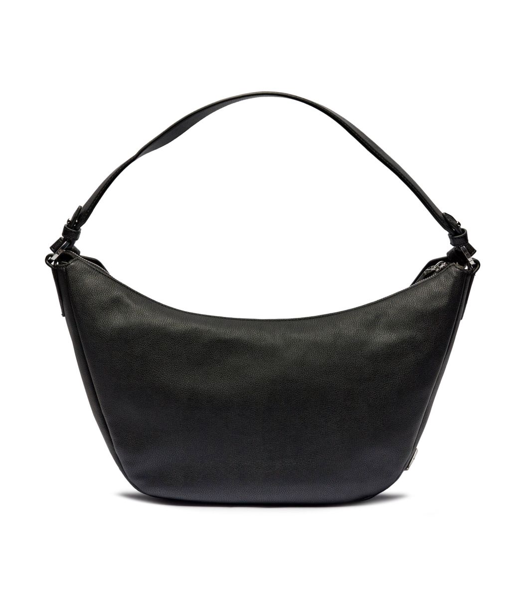 Фирменная сумка-хобо с короткой ручкой для носки, съемным регулируемым ремнем на плечо из брендированной ленты и миниатюрной ключницей на молнии. В качестве акцента используется тиснение с логотипом бренда.
